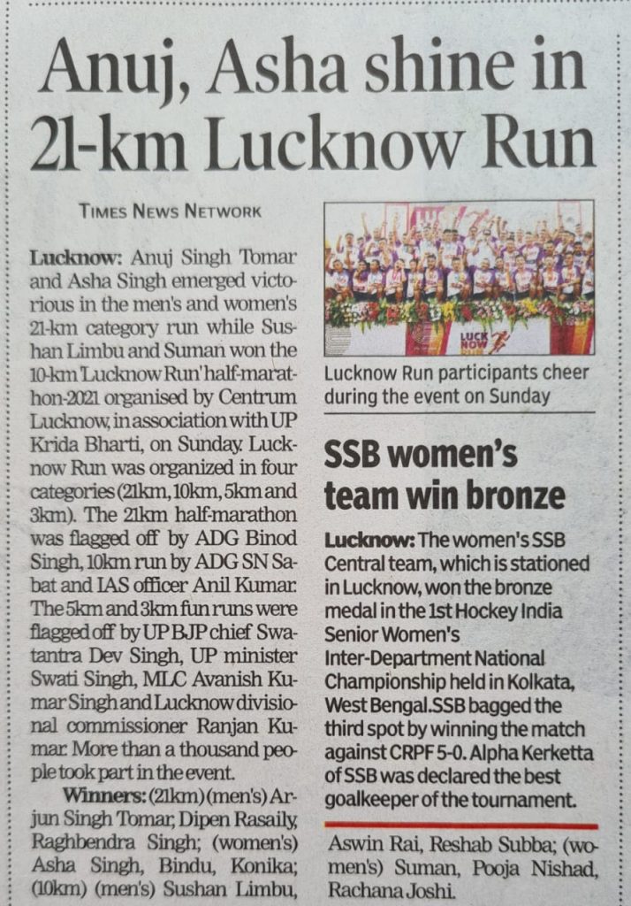 Anuj Singh Tomar and Asha Singh emerged victorious in the men’s and women’s 21-km category run while Sushan Limbu and Suman won the 10-km Lucknow Run’half-marathon-2021 organised by Centrum Lucknow, in association with UP Krida Bharti, on Sunday. Lucknow Run was organized in four categories (21km, 10km, 5km and 3km). The 21km half-marathon was flagged off by ADG Binod Singh, 10km run by ADG SN Sabat and IAS officer Anil Kumar. The 5km and 3km fun runs were flagged off by UPBJP chief Swatantra Dev Singh, UP minister Swati Singh, MLC Avanish Kumar Singh and Lucknow divisional commissioner Ranjan Kumar More than a thousand people took part in the event.