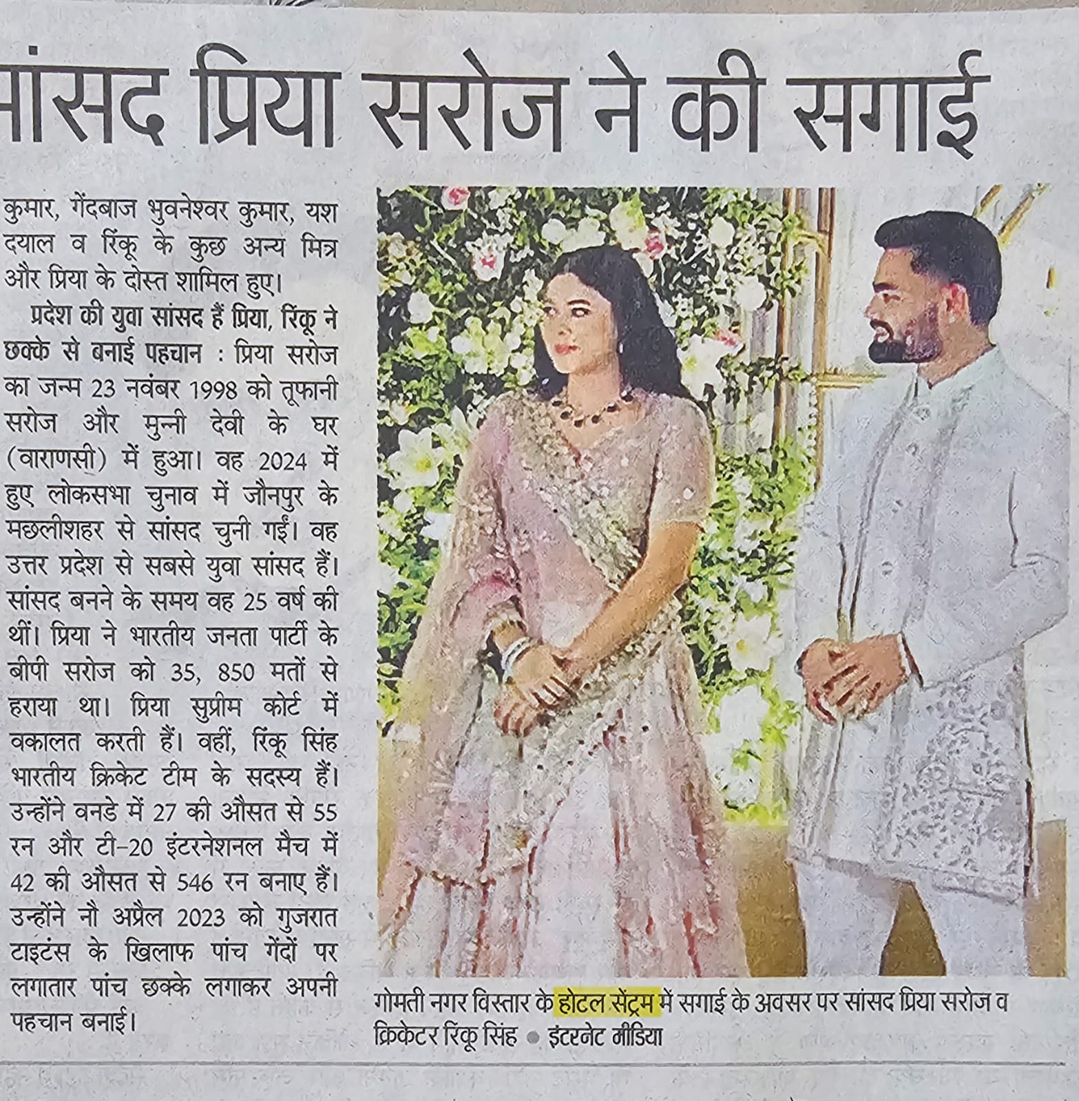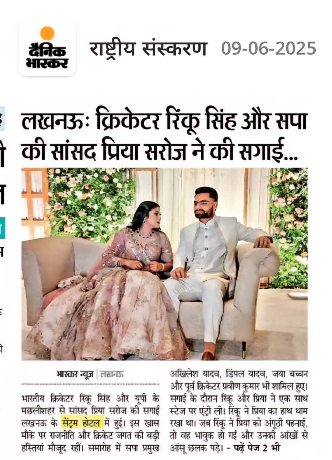 On June 8, 2025, The Centrum Hotel in Lucknow radiated with celebration and splendor as Indian cricketer Rinku Singh exchanged rings with Member of Parliament Priya Saroj in a ceremony that was as heartfelt as it was high-profile. The event marked a perfect union—not just of two individuals, but of love, legacy, and Lucknow’s most prestigious venue for special occasions.